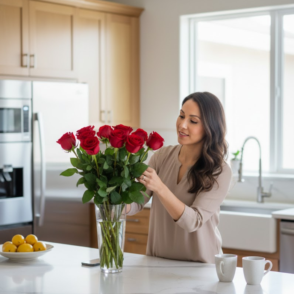 Cada rosa representa un sentimiento profundo: pasión, compromiso y cariño sincero. Su presentación en jarrón realza la composición, convirtiéndola en un detalle atemporal que ilumina cualquier espacio con su presencia.
