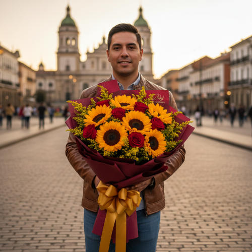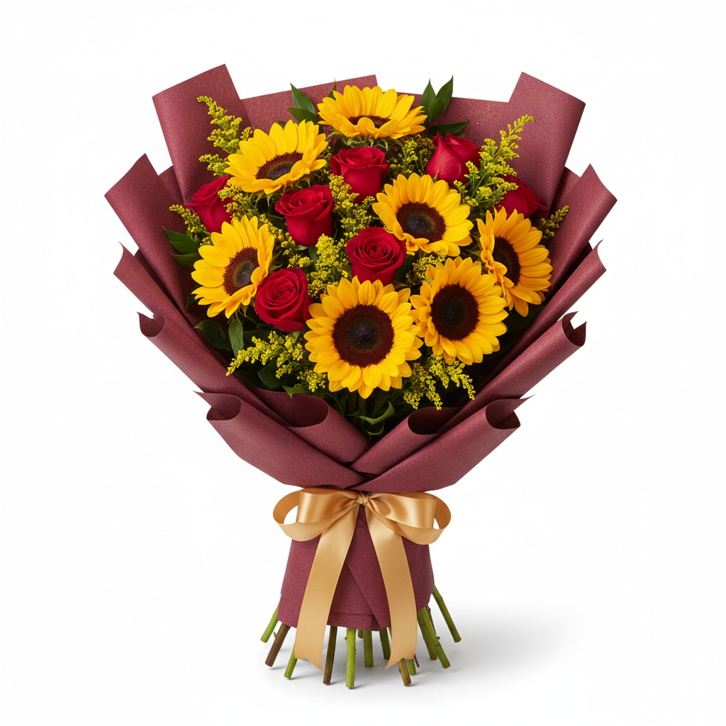 Amore Mio combina la calidez radiante de los girasoles, la pasión de las rosas rojas y la ternura del solidago, en un bouquet que transmite alegría, amor sincero y gratitud pura.