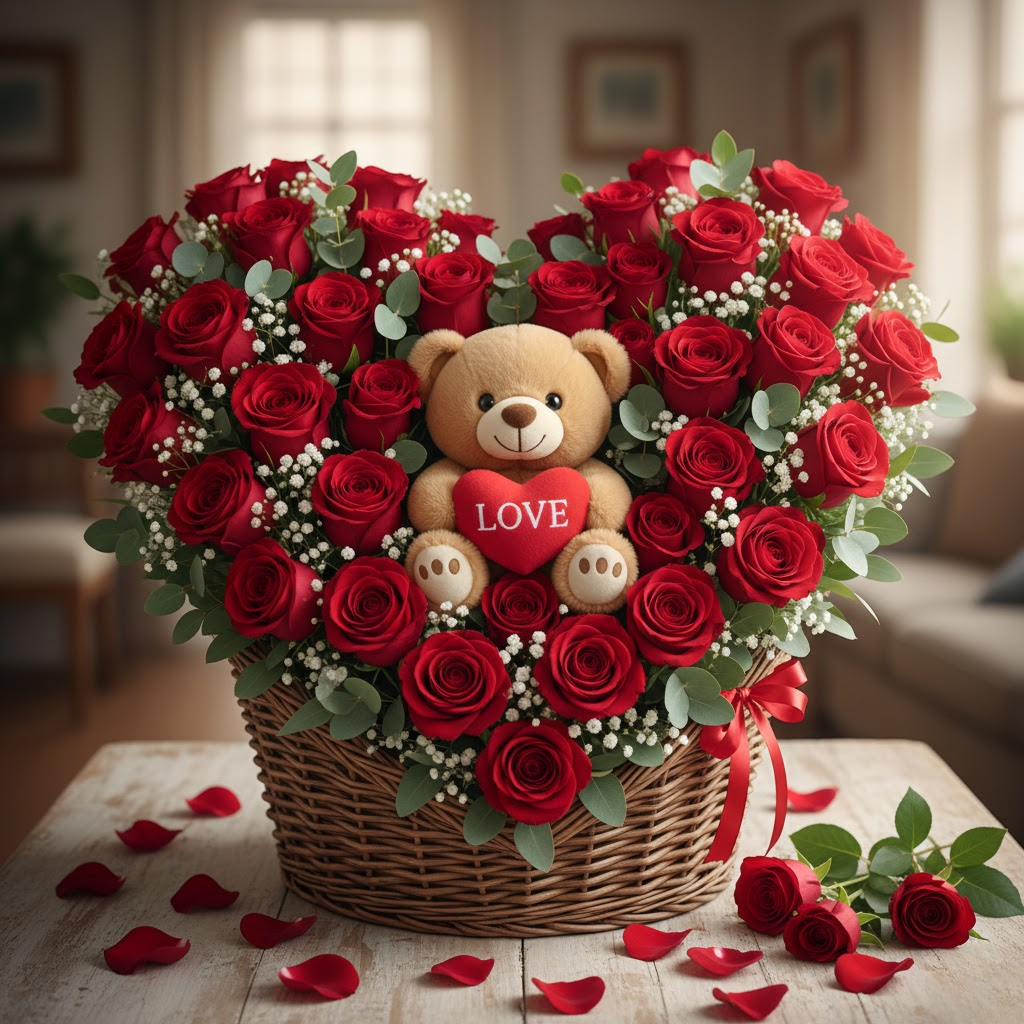 Bienvenido, Amor es un diseño floral en forma de corazón elaborado con rosas rojas premium, delicadamente acompañadas de follajes y detalles suaves que enmarcan un tierno peluche central.