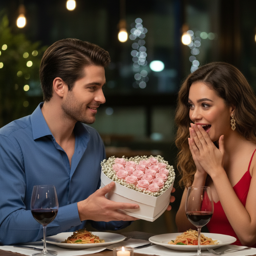 Dentro de una delicada caja en forma de corazón, las rosas rosadas frescas se rodean de un suave halo de gypsophila blanca, creando un diseño que transmite ternura, pureza y amor sincero.