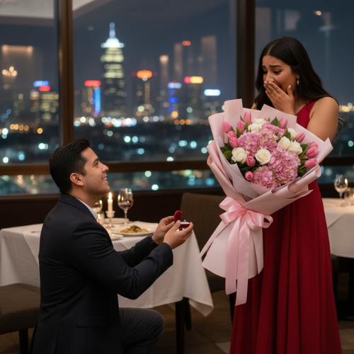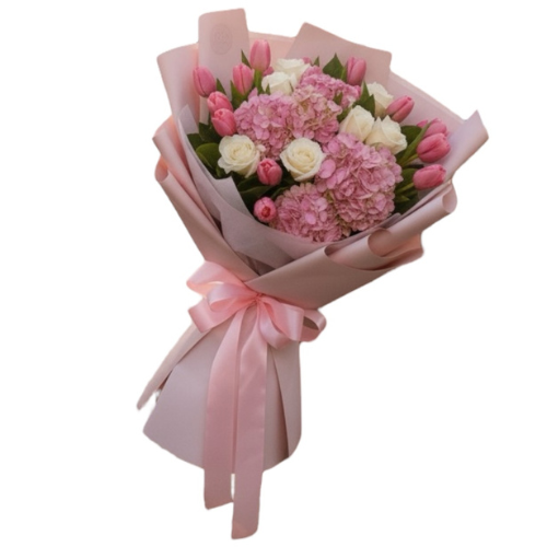 Sus rosas rojas y rosadas se entrelazan con la elegancia de los tulipanes y la textura romántica de las hortensias, creando una composición que irradia amor, ilusión y promesa.
