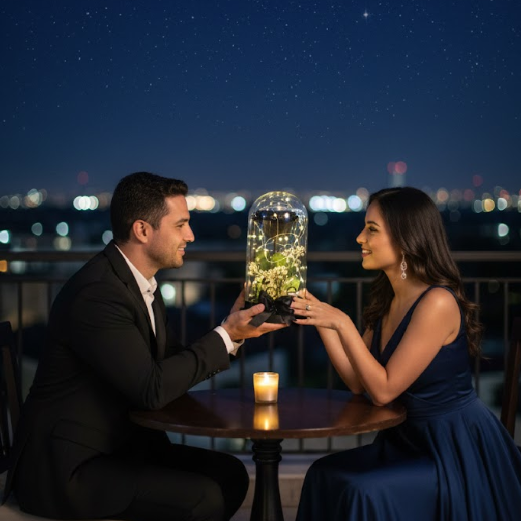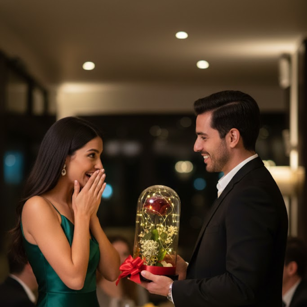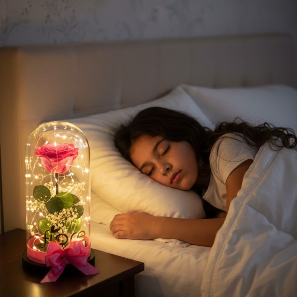 Encapsulada en una elegante cúpula de vidrio, iluminada con micro luces cálidas y acompañada de un lazo satinado, esta rosa representa amor que permanece, promesas que no caducan y momentos que merecen quedarse.
