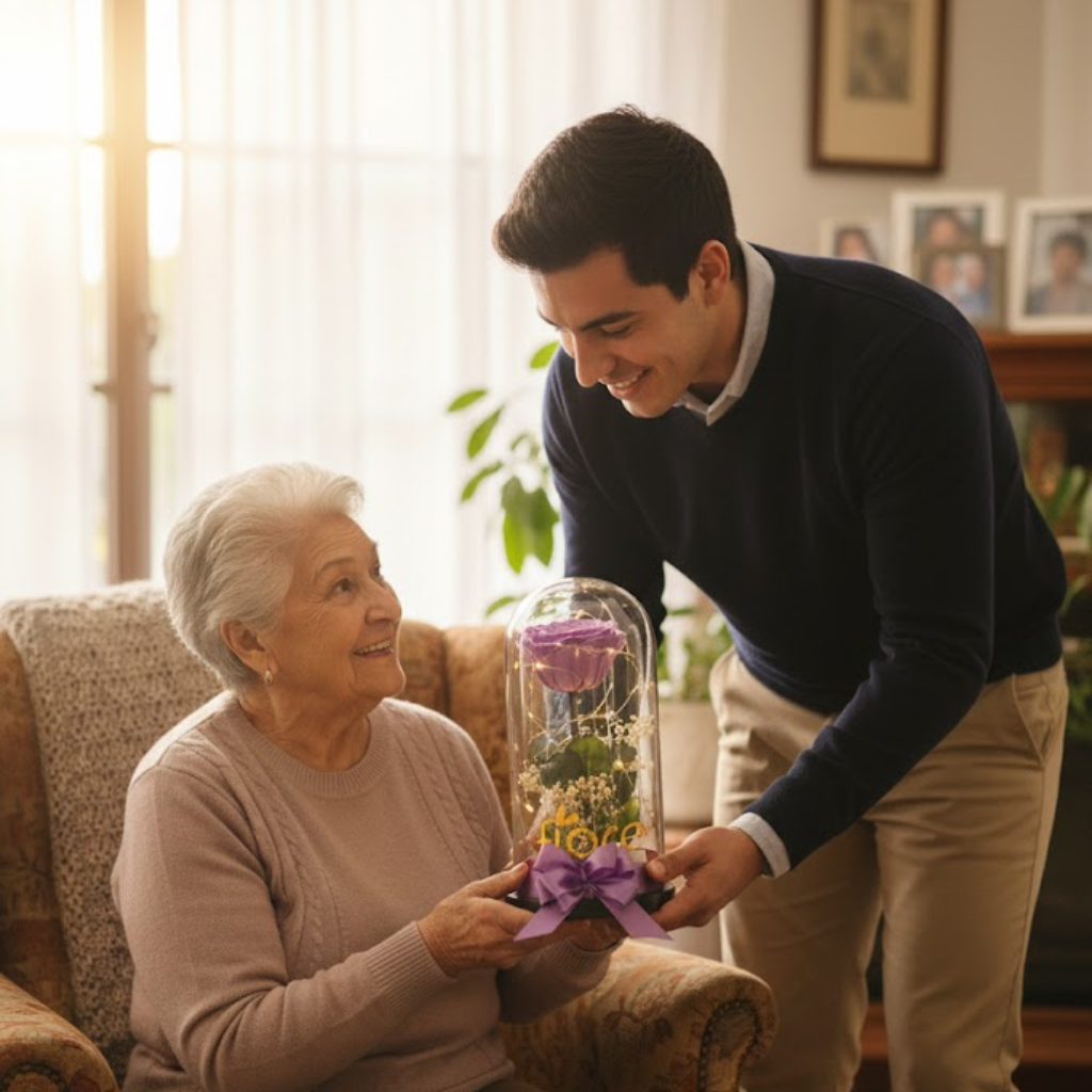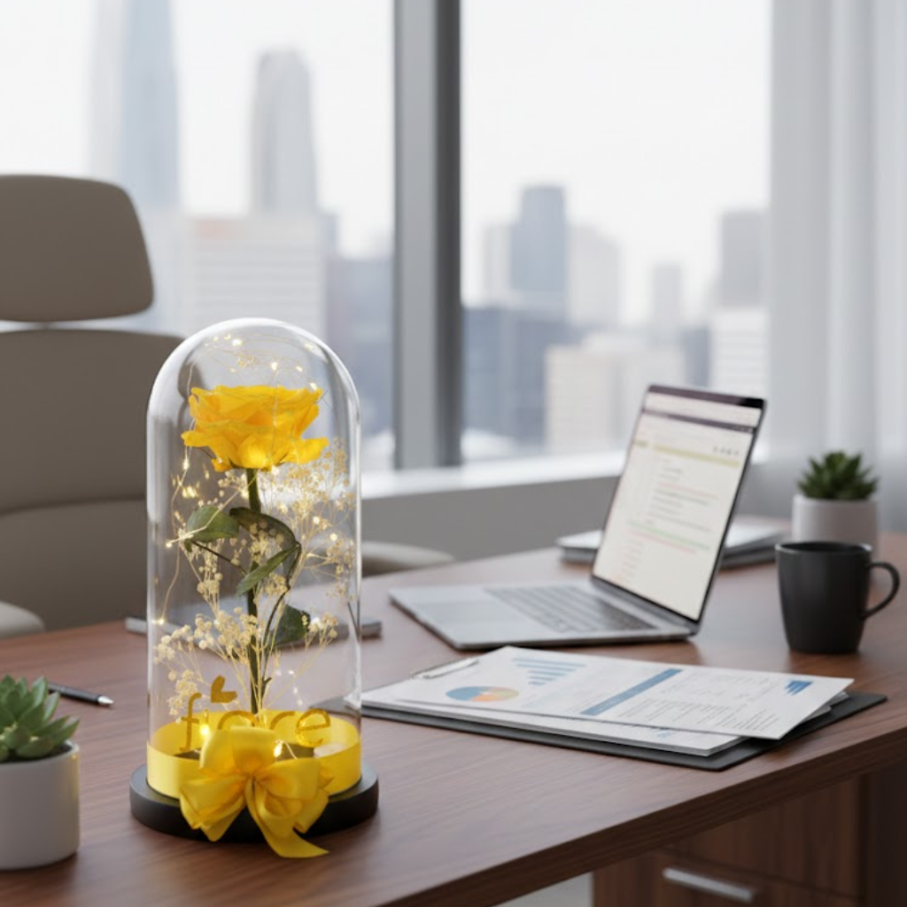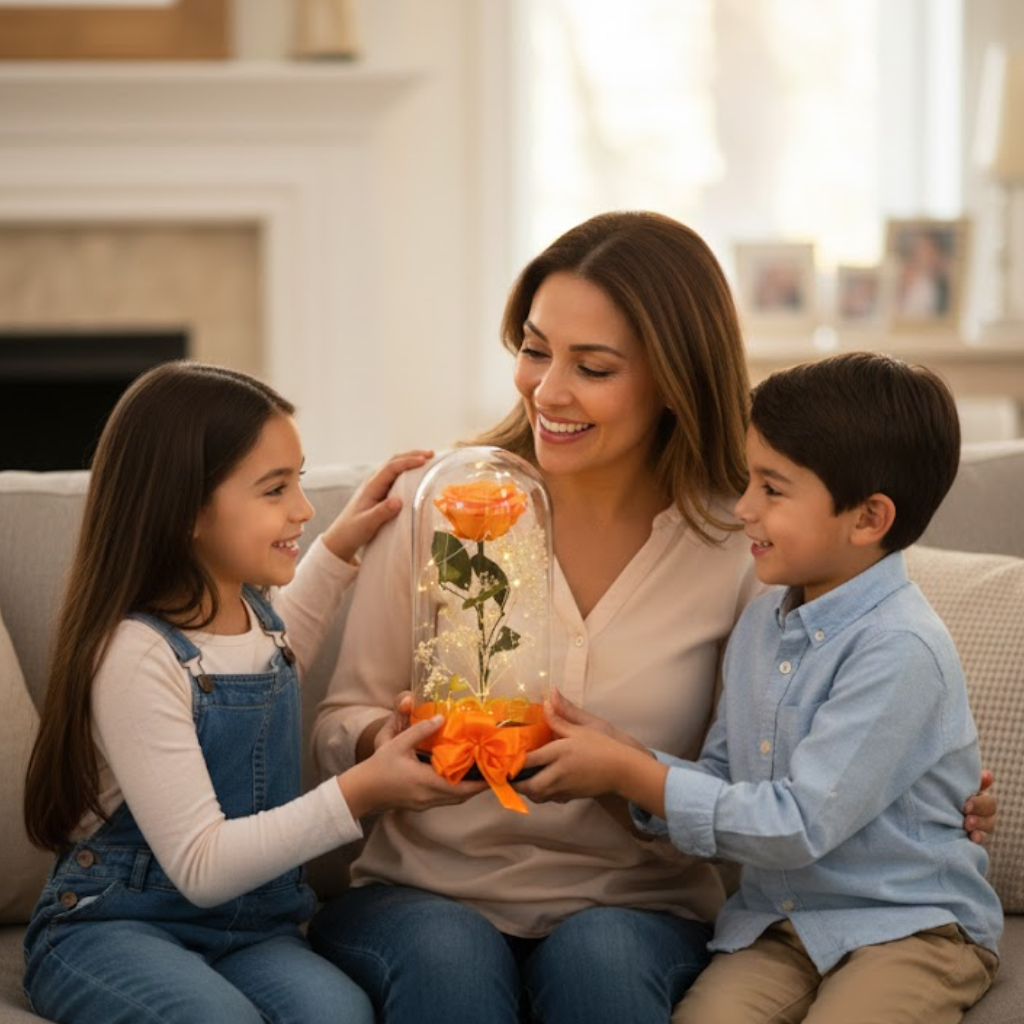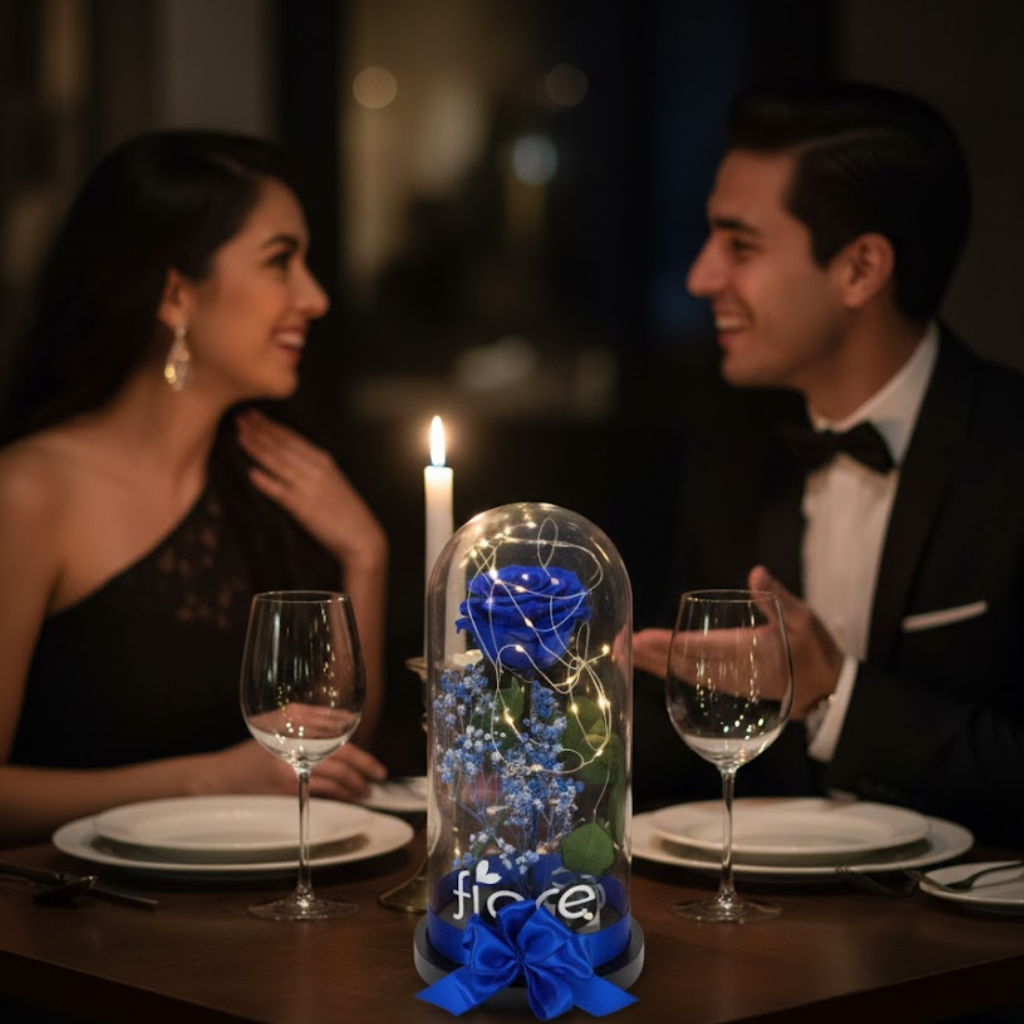 Encapsulada en una elegante cúpula de vidrio, iluminada con micro luces cálidas y acompañada de un lazo satinado, esta rosa representa amor que permanece, promesas que no caducan y momentos que merecen quedarse.