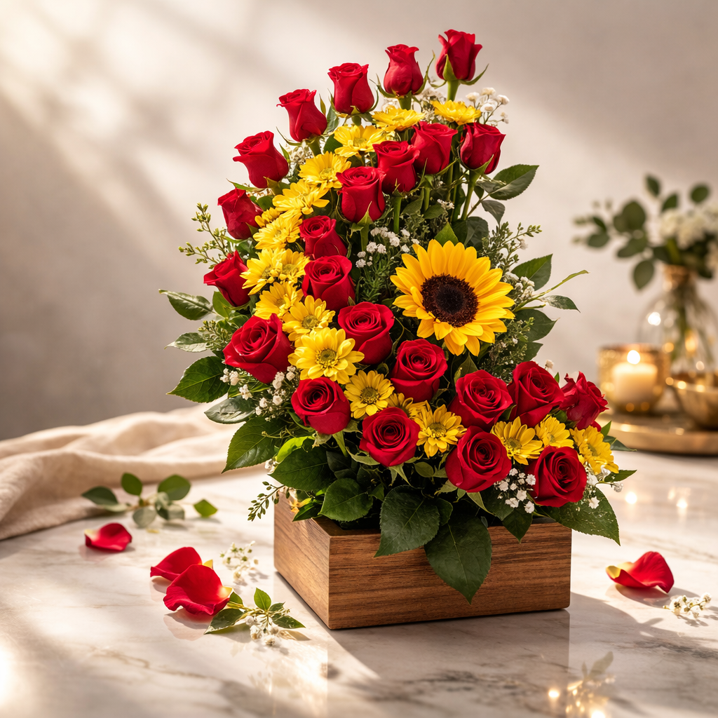 Este arreglo floral está compuesto por 24 rosas frescas combinadas con margaritas, cuidadosamente dispuestas en forma de medialuna sobre una sofisticada base de madera. Una composición equilibrada que transmite carácter, romanticismo y serenidad en cada detalle.