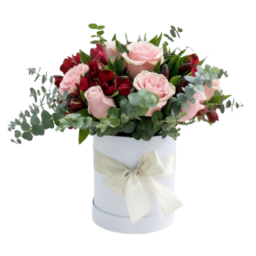Caja Floral de Rosas, Astromelias y Eucalipto