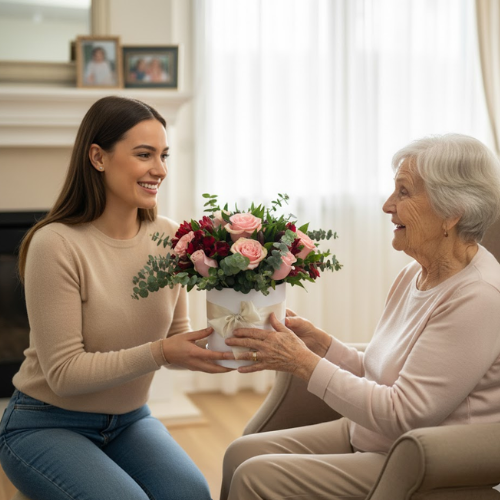 Te Pienso es una caja floral diseñada para acompañar desde el corazón: un arreglo de rosas, astromelias y ramitas de eucalipto que susurran presencia, calma y cariño en cada pétalo.